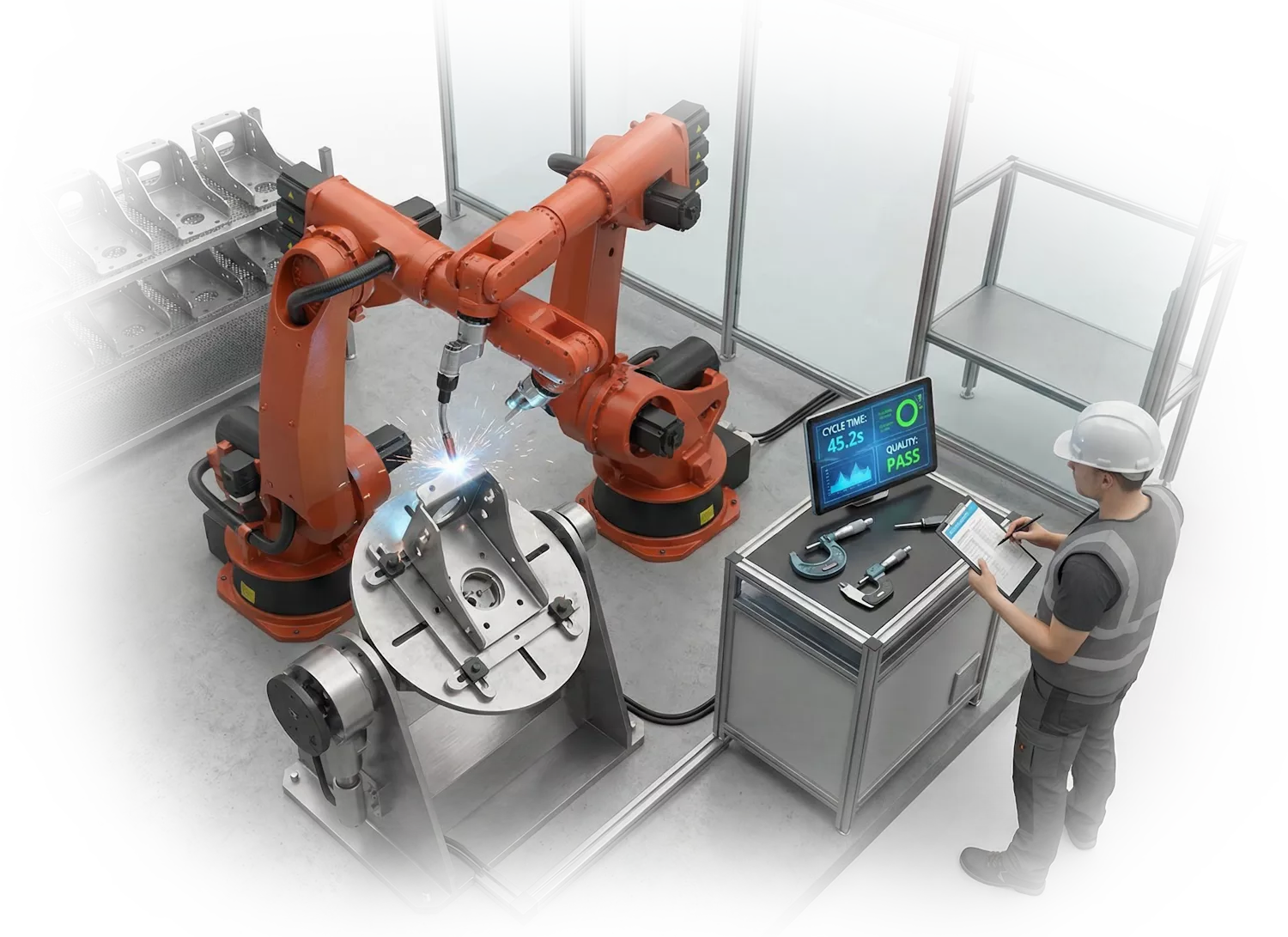 Мы производственная инженерная компания, специализирующаяся на роботизации сварочных процессов. В нашем распоряжении собственный цех с оборудованием для изготовления позиционеров, оснастки и элементов роботизированных ячеек. Полный контроль качества на всех этапах производства.